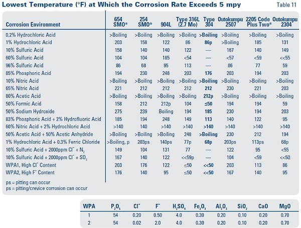 下图将304型与其他不锈钢在各种常见的腐蚀环境中进行比较。该表显示腐蚀率超过5mpy的最低温度。所有测试均按照化学加工工业材料技术研究所(MTI)的要求进行。